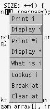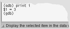 Het "Source Window" bevat de code van het programma. Het "Debug Console" toont een "gdb" prompt waar eventueel commando's kunnen worden ingevoerd. Er is ook een popup window waarmee je veelvoorkomende commando's met 1 druk op de knop kunt uitvoeren.