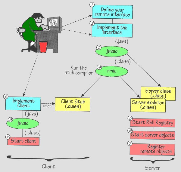 In de onderstaande figuur worden de stappen getoond, die uitgevoerd moeten worden om een RMI client- en serverclass te maken. Hierbij wordt gebuik gemaakt van de Java omgeving die je ook bij opdracht 3 hebt gebruikt.