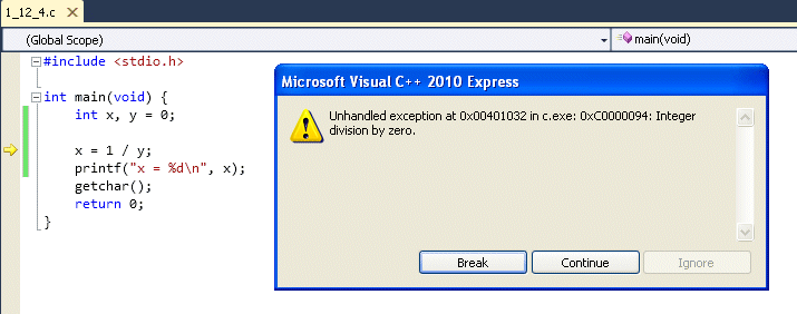 #include <stdio.h>int main(void) {int x, y = 0;x = 1 / y;printf("x = %d\n", x);getchar();return 0;}