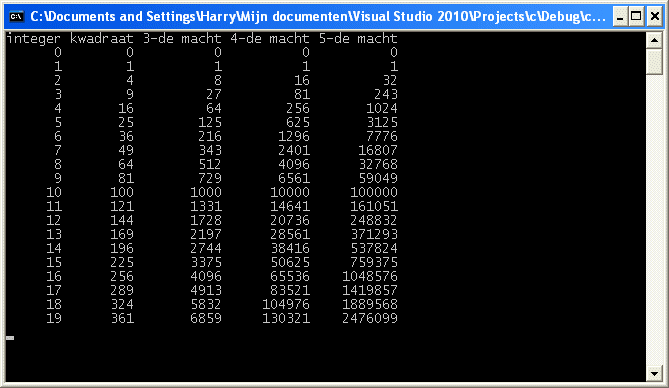 #include <stdio.h>int main(void) {int i;printf("integer kwadraat 3-de macht 4-de macht 5-de macht\n");for (i = 0; i < 20; i = i + 1) {printf("%-7d %-8d %-10d %-10d %-10d\n", i, i * i, i * i * i, i * i * i * i, i * i * i * i * i);}getchar();return 0;}
