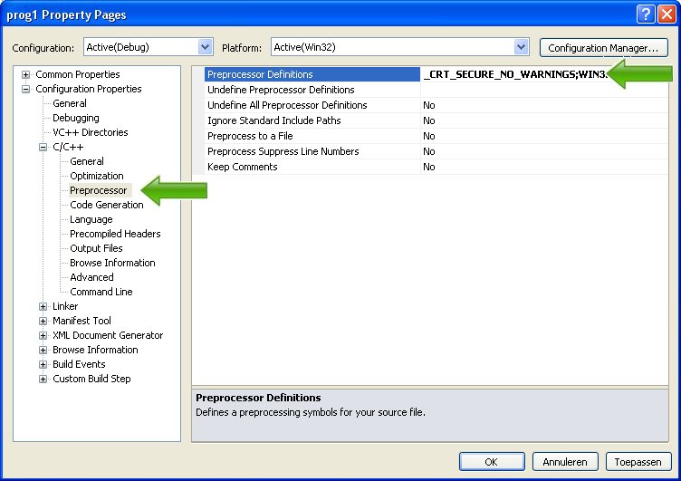 Klik vervolgens op Configuration Properties, C/C++, Preprocessor en plaats