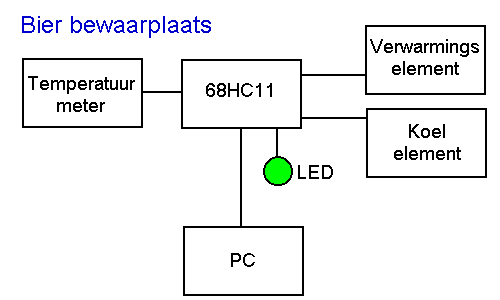 De temperatuurmeter geeft een analoge spanning af. Deze spanning wordt via ingang PE0 in de 68HC11 ingelezen. Het verwarmings- en koelelement worden met een digitale uitgang (0V = uit, 5V = aan) aangestuurd. De uitgang PB0 van de 68HC11 wordt gebruikt om het verwarmingselement aan te sturen en de uitgang PB1 wordt gebruikt voor het koelelement. De LED is verbonden met de uitgang PB2 van de 68HC11. De PC kan via een seriele verbinding met de 68HC11 verbonden worden. De PC kan gebruikt worden om te communiceren met het besturingsprogramma dat door de 68HC11 uitgevoerd wordt. Vanuit de PC wordt een commando naar de 68HC11 gestuurd waarna de 68HC11 een antwoord naar de PC terugstuurd. Op dit moment is nog maar 1 commando gedefinieerd maar dat kan in de toekomst nog uitgebreid worden. Als de PC het karakter '?' naar de 68HC11 stuurt dan moet 1 van de 3 volgende antwoorden worden teruggestuurt: