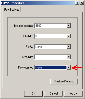 Let er bij het gebruik van hyperterminal op dat Flow Contole op None staat: