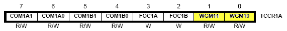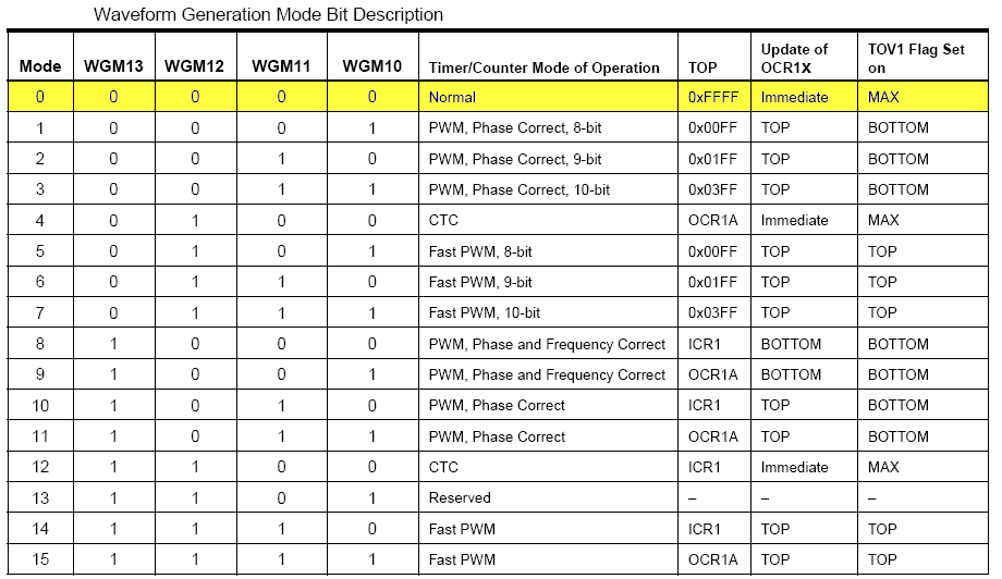 Informatie over de benodigde I/O registers van Timer/Counter1 kun je vinden in de datasheet van de ATmega32. De belangrijkste registers en tabellen zijn hieronder weergegeven: