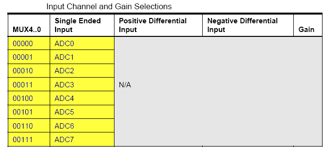 In het hoofdstuk "Analog to Digital Converter" van de datasheets van de ATmega32 wordt uitgelegd hoe de ADC gebruikt kan worden. De belangrijkste gegevens, registers en tabellen zijn hieronder weergegeven: