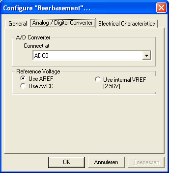 Op het AVR STK500 practicumbord bevindt zich een potentiometer. Met deze potentiometer kun je de spanning op PA0 varieren. De potentiometer vervangt dus bij het testen de temperatuurmeter.