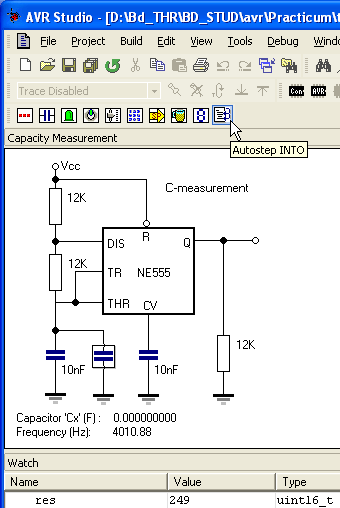 Als er geen Cx wordt aangesloten (Cx = 0) is de periodetijd ongeveer 250 µs. Je mag ervan uitgaan dat Cx maximaal 0,5 µF is (de periodetijd is dan ongeveer 13000 µs). De klokfrequentie van de ATmega32 op het STK500 practciumbord is ingesteld op exact 3.686400 MHz.