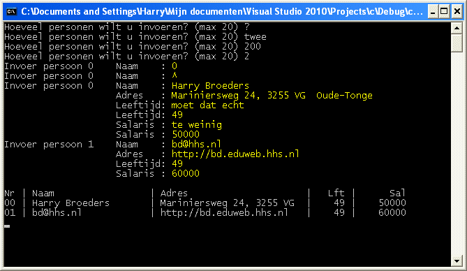 #include <stdio.h>int main(void) {int aantal = 0;int teller;struct {char naam[21];char adres[26];int leeftijd;int salaris;} rij[20];/* Invoer */do {printf("Hoeveel personen wilt u invoeren? (max 20) ");fflush(stdin);}while (scanf("%d", &aantal) != 1 || aantal < 1 || aantal > 20);for (teller = 0; teller < aantal; ++teller) {do {printf("Invoer persoon %d Naam : ", teller);fflush(stdin);} while (scanf("%20[A-Za-z.@+()\- ]", rij[teller].naam) != 1);do {printf(" Adres : ");fflush(stdin);} while (scanf("%25[A-Za-z0-9.,?:/()\- ]", rij[teller].adres) != 1);do {printf(" Leeftijd: ");fflush(stdin);} while (scanf("%d", &rij[teller].leeftijd) != 1);do {printf(" Salaris : ");fflush(stdin);} while (scanf("%d", &rij[teller].salaris) != 1);}/* Uitvoer */printf("\n");printf("%2s | %-20s | %-25s | %5s | %8s\n", "Nr", "Naam", "Adres", "Lft", "Sal");for (teller = 0; teller < aantal; ++teller) {printf("%02d | %-20s | %-25s | %5d | %8d\n",teller,rij[teller].naam,rij[teller].adres,rij[teller].leeftijd,rij[teller].salaris);}fflush(stdin);getchar();return 0;}