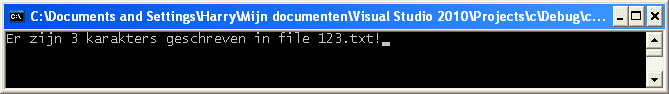 #include <stdio.h>int main(void) {int i = 123;FILE *fp;int ret;fp = fopen("123.txt", "w");if (fp == NULL) {printf("Kan file 123.txt niet openen!");}else {ret = fprintf(fp, "%d", i);if (ret == EOF) {printf("Er is iets fout gegaan bij schrijven in file 123.txt!");}else {printf("Er zijn %d karakters geschreven in file 123.txt!", ret);}fclose(fp);}getchar();return 0;}