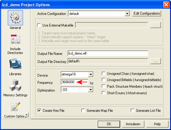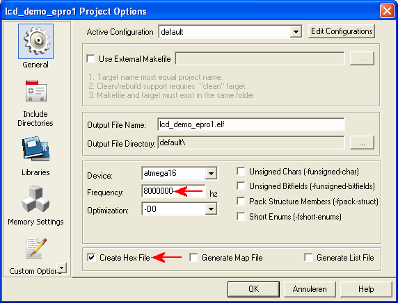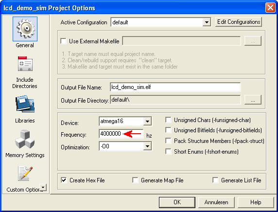 Vul de juiste CPU klokfrequentie in bij de Project Configuration Options.