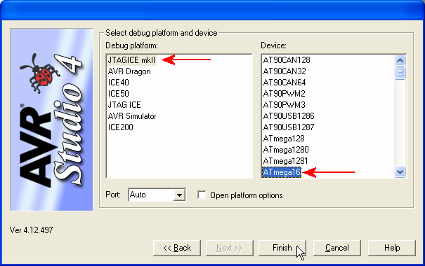 Kies JTAGICE mkII en ATmega16.