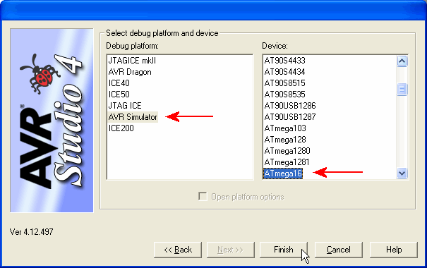 Kies AVR Simulator en ATmega16.