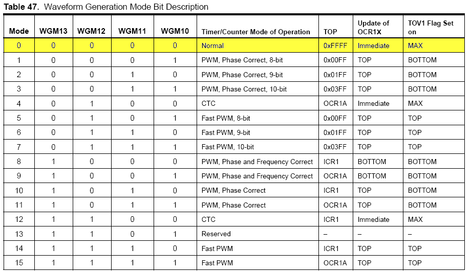 Informatie over de benodigde I/O registers van Timer/Counter1 kun je vinden in de datasheet van de ATmega16. De belangrijkste registers en tabellen zijn hieronder weergegeven: