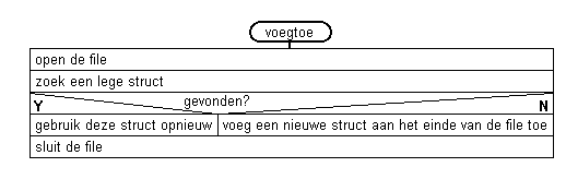 #include <stdio.h>struct Persoon {int sleutel;int leeg;char naam[80];};void voegtoe(void) {FILE* fp;struct Persoon p;int gevonden=0;fp=fopen("persoon.geg", "rb+");if (fp==NULL) {char antw;do {printf("Kan persoon.geg niet vinden. Nieuw bestand openen? (J/N): ");fflush(stdin);} while (scanf("%c", &antw)!=1 || antw!='J' && antw!='j' && antw!='N' && antw!='n');if (antw=='J' || antw=='j') {fp=fopen("persoon.geg", "wb+");if (fp==NULL) {printf("Error: Kan persoon.geg niet aanmaken.\n");}}}if (fp!=NULL) {p.sleutel=-1;while (gevonden==0 && fread(&p, sizeof p, 1, fp)==1) {if (p.leeg==1) {gevonden=1;}}if (gevonden==1) {fseek(fp, -1 * sizeof p, SEEK_CUR);}else {++p.sleutel;}p.leeg=0;do {printf("Geef naam voor persoon %d:\n", p.sleutel);fflush(stdin);} while(scanf("%79[ a-zA-Z]", p.naam)!=1);fwrite(&p, sizeof p, 1, fp);fclose(fp);}}void verwijder(void) {FILE* fp;fp=fopen("persoon.geg", "rb+");if (fp==NULL) {printf("Error: de file persoon.geg kan niet geopend worden.\n");}else {int sleutel;struct Persoon p;do {printf("Geef nummer: ");fflush(stdin);}while(scanf("%d", &sleutel)!=1);fseek(fp, sleutel * sizeof p, SEEK_SET);if (fread(&p, sizeof p, 1, fp)!=1) {printf("Error: de persoon kan niet gevonden worden.\n");}else {if (p.leeg==1) {printf("Error: de persoon kan niet gevonden worden.\n");}else {p.leeg=1;fseek(fp, -1 * sizeof p, SEEK_CUR);if (fwrite(&p, sizeof p, 1, fp)!=1) {printf("Error: de persoon kan niet verwijderd worden.\n");}}}fclose(fp);}}void zoek(void) {FILE* fp;fp=fopen("persoon.geg", "rb");if (fp==NULL) {printf("Error: de file persoon.geg kan niet geopend worden.\n");}else {int sleutel;struct Persoon p;do {printf("Geef nummer: ");fflush(stdin);}while(scanf("%d", &sleutel)!=1);fseek(fp, sleutel * sizeof p, SEEK_SET);if (fread(&p, sizeof p, 1, fp)!=1) {printf("Error: de persoon kan niet gevonden worden.\n");}else {if (p.leeg==1) {printf("Error: de persoon kan niet gevonden worden.\n");}else {printf("%6d %s\n", p.sleutel, p.naam);}}fclose(fp);}}void drukaf(void) {FILE* fp;fp=fopen("persoon.geg", "rb");if (fp==NULL) {printf("Error: de file persoon.geg kan niet geopend worden.\n");}else {struct Persoon p;while (fread(&p, sizeof p, 1, fp)==1) {if (p.leeg==0) {printf("%4d %s\n", p.sleutel, p.naam);}}fclose(fp);}}void main() {int antw;do {printf("0. Stoppen.\n""1. Afdrukken.\n""2. Toevoegen.\n""3. Verwijderen.\n""4. Zoek op nummer.\n""\n""Geef keuze: ");fflush(stdin);if (scanf("%d", &antw)!=1) {printf("Error: invoer is geen getal.\n");}else {switch (antw) {case 0:break;case 1:drukaf(); break;case 2:voegtoe(); break;case 3:verwijder(); break;case 4:zoek(); break;default:printf("Error: verkeerde invoer.\n");}}}while (antw!=0);}