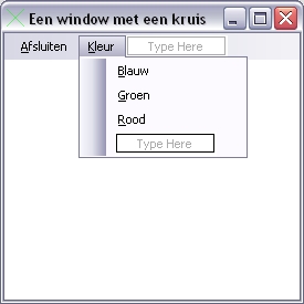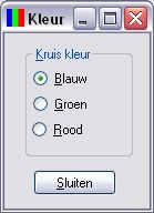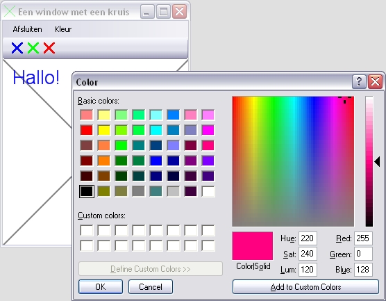 Windows kent een aantal zogenaamde "common dialogs". Dit zijn standaard in Windows beschikbare dialogs. Laten we ons programma eens uitbreiden met de standaard dialog om een kleur te kiezen.