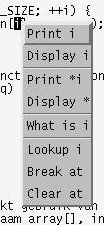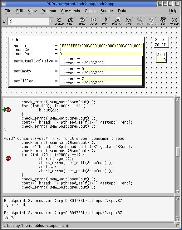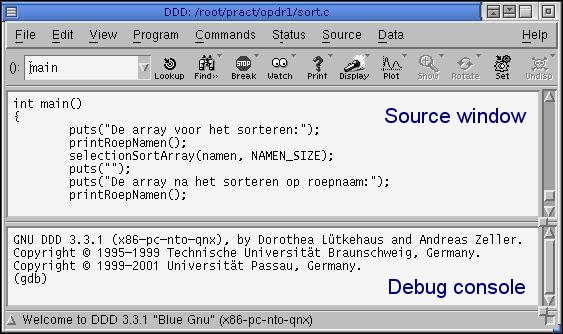 Het "Source Window" bevat de code van het programma. Het "Debug Console" toont een "gdb" prompt waar eventueel commando's kunnen worden ingevoerd. Er is ook een popup window waarmee je veelvoorkomende commando's met 1 druk op de knop kunt uitvoeren.