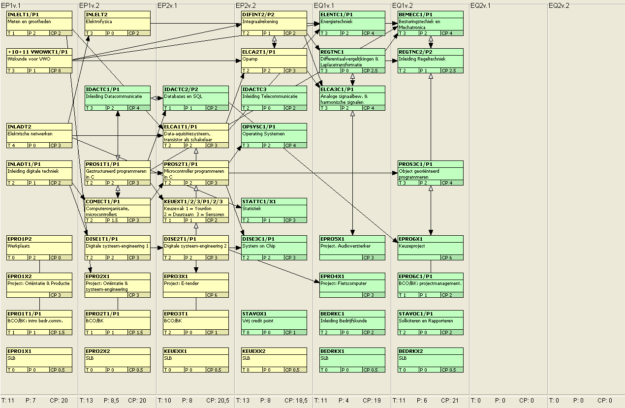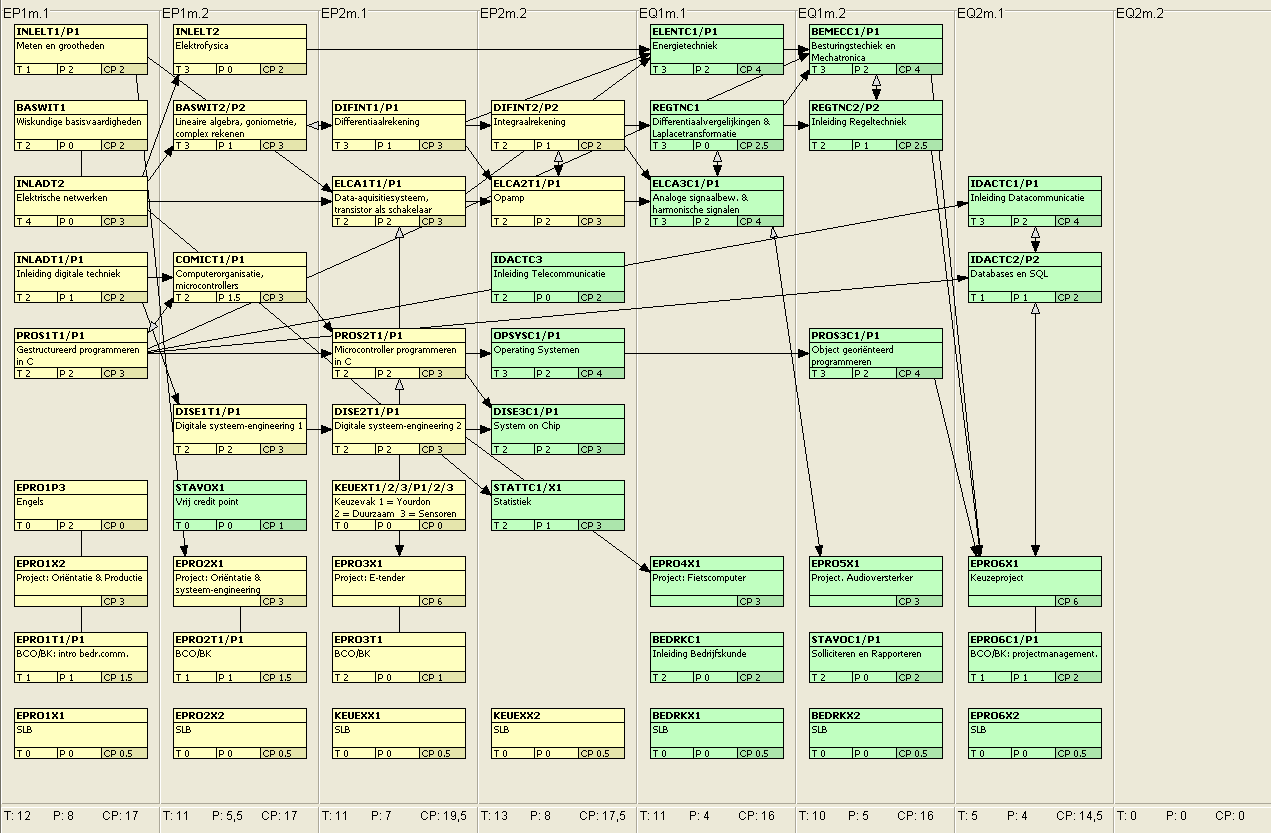 De moduleonderdelen waaruit dit studieprogramma bestaat staan weergegeven in het onderstaande overzicht. Het eerste jaar is de propedeuse fase. De moduleonderdelen uit de propedeuse zijn geel gekleurd. Na de propedeuse fase start de hoofdfase. De moduleonderdelen uit de hoofdfase zijn groen gekleurd. Moduleonderdelen waarvan de naam met dezelfde 5 karakters beginnen vormen samen een module. Als je wilt weten uit welke moduleonderdelen een module bestaat kun je beter op in het semesteraanbod kijken. Het onderstaande overzicht is bedoeld om de samenhang tussen de verschillende modules duidelijk te maken.