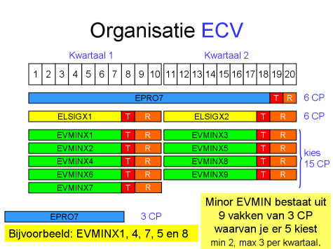 Zoals je hierboven kunt zien bestaat het semester ECV uit twee delen: De kern en de minor. Beide delen hebben een omvang van 15 creditpoints. Het kerndeel bestaat uit 2 onderwijseenheden: Elektrische Signalen (ELSIG) en Elektro Project 7 (EPRO7). In het minordeel mag je zelf een minor kiezen. De opleiding Elektrotechniek beveelt je aan te kiezen voor de Verdiepende Minor Elektrotechniek (EVMIN). Deze minor bestaat uit 9 verdiepende "vakken" op het gebied van de Elektrotechniek waar je er 5 van kiest. Elk vak heeft een omvang van 3 creditpoints, dus de totale minor heeft een omvang van 15 creditpoints. Als je in ECV een andere minor van 15 creditpoints wilt volgen dan is dat alleen mogelijk met toestemming van de toetscommissie van de Opleiding Elektrotechniek.