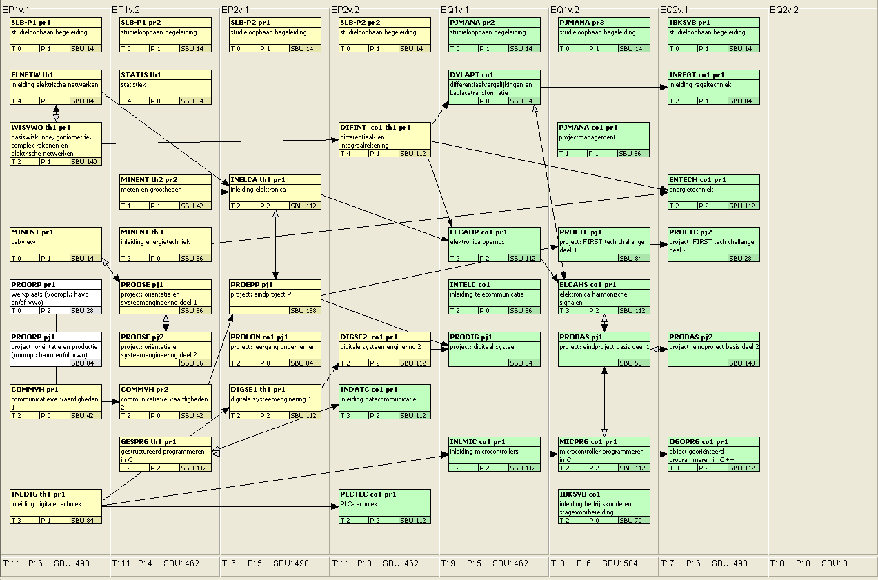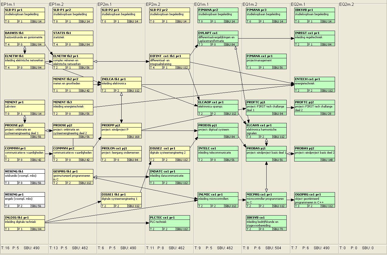 De moduleonderdelen waaruit dit studieprogramma bestaat staan weergegeven in het onderstaande overzicht. Het eerste jaar is de propedeuse fase. De moduleonderdelen uit de propedeuse zijn geel gekleurd. Na de propedeuse fase start de hoofdfase. De moduleonderdelen uit de hoofdfase zijn groen gekleurd. Moduleonderdelen waarvan de naam dezelfde is vormen samen een module. Als je wilt weten uit welke moduleonderdelen een module precies bestaat kun je beter in het semesteraanbod kijken. Het onderstaande overzicht is bedoeld om de samenhang tussen de verschillende modules duidelijk te maken.