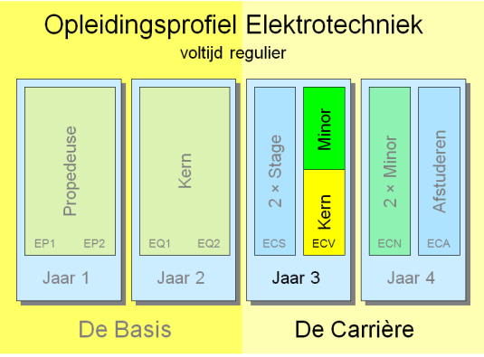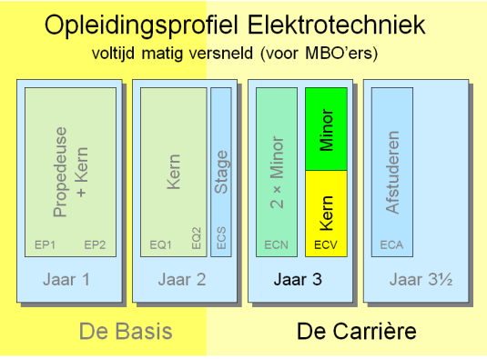 De opleiding Elektrotechniek bestaat uit twee delen: het basisdeel en het carrièredeel. Het carrièredeel beslaat 4 semesters: ECS (stage), ECV (voorjaar), ECN (najaar) en ECA (afstuderen). In het carrièredeel willen we de studenten veel keuzemogelijkheden geven. Om deze reden zijn in dit deel van de opleiding 3 minoren van elk 15 studiepunten opgenomen: twee in semester ECN en één in semester ECV. Het semester ECV wordt alleen in het voorjaar aangeboden (vandaar de naam: Elektrotechniek Carrière Voorjaar). Als je deelneemt aan ECV dan heb je de basis van de E opleiding al gevolgd en heb je ook al stage gelopen. Als reguliere student volg je ECV meteen na de stage maar als versnellende (of vertraagde) student volg je ECV pas na ECN.