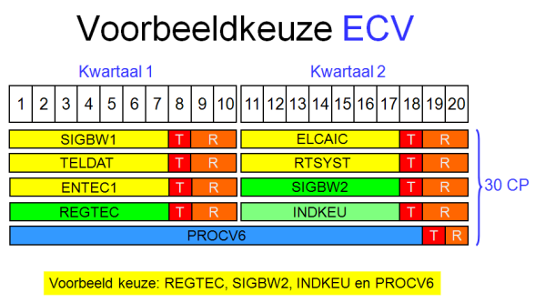 Een beschrijving van deze delen kun je vinden in het Semesterboekje ECV. Twee van deze vakken (REGTEC en ALGODS) worden in het eerste kwartaal van ECV aangeboden. De andere twee vakken (ENTEC2 en SIGBW2) worden in het tweede kwartaal van ECV aangeboden. Elk vak heeft een omvang van 3 studiepunten en bestaat uit 4 delen: