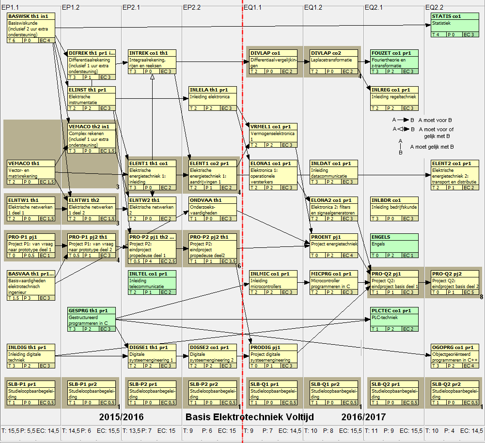 De moduleonderdelen waaruit het voltijd studieprogramma van de basis bestaat staan weergegeven in het onderstaande overzicht. Het eerste jaar is de propedeuse fase. Na de propedeuse fase start de hoofdfase. Moduleonderdelen waarvan de naam dezelfde is vormen samen een module. De moduleonderdelen die voor de duale studenten in hetzelfde kwartaal worden aangeboden zijn geel gekleurd. De moduleonderdelen die voor de duale studenten in een ander kwartaal worden aangeboden zijn groen gekleurd. Als je wilt weten uit welke moduleonderdelen een module precies bestaat kun je beter in het semesteraanbod kijken. Het onderstaande overzicht is bedoeld om de samenhang tussen de verschillende modules duidelijk te maken.