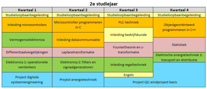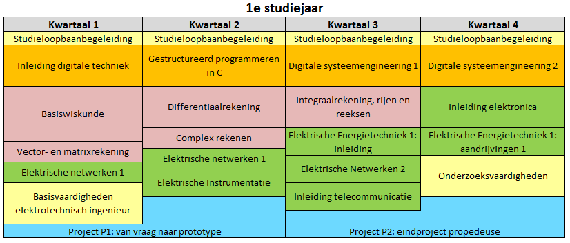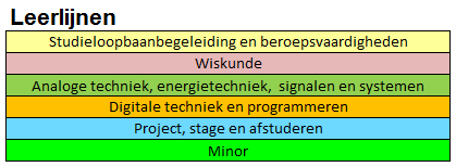 Hieronder kun je zien hoe de verschillende leerlijnen in de eerste twee jaar van de voltijd opleiding Elektrotechniek zijn opgebouwd.