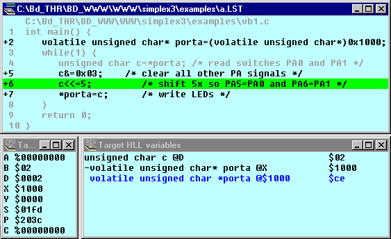 Je kunt het Simplex3 bord ook in C/C++ programmeren met behulp van de GNU gcc compiler. Deze compiler is opgenomen in de volledige installatie van THRSim11. Meer informatie over het debuggen van een C programma met behulp van THRSim11 kun je vinden op: http://bd.eduweb.hhs.nl/thrsim11/hllsupport.htm.