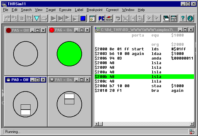 Je kunt een programma in het Simplex3 bord laden met behulp van THRSim11. Het is ook mogelijk een programma op het bord te debuggen (breakpoints zetten, registers en geheugen bekijken, single steppen enz.). Let op: jumper JP1 (TRACE) moet op de stand PA3 staan.
