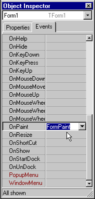 Klik op de tab Events en selecteer de regel OnPaint en dubbelklik