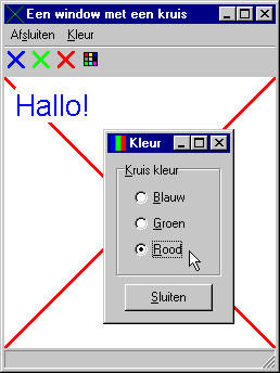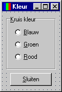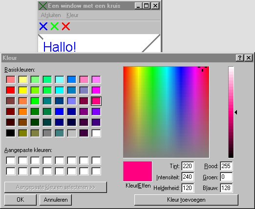 Windows kent een aantal zogenaamde "common dialogs". Dit zijn standaard in Windows beschikbare dialogs. Laten we ons programma eens uitbreiden met de standaard dialog om een kleur te kiezen.