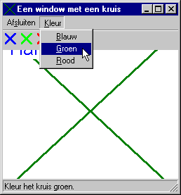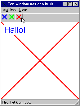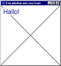 Opdracht B.Pas het programma nu zodanig aan dat het kruis met een groene stippellijn die slechts 1 pixel dik is wordt getekend. Zorg er tevens voor dat de tekst veel groter en in een rode kleur wordt weergegeven. |
